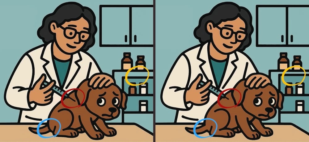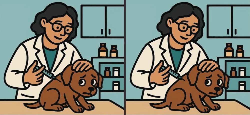 Tak co, jste připraveni na další výzvu? Podívejte se pozorně na dva obrázky veterináře, který dává psovi injekci. Na první pohled mohou snímky vypadat stejně, ale jsou zde tři malé rozdíly. Myslíte, že je všechny najdete za 63 sekund? Zkuste to a otestujte svou ostrost zraku!