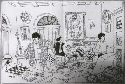 5. Nejmladší osobou na obrázku je chlapec vpravo. Prohlíží si knihy. Když se však podíváte na jeho košili, všimnete si, že na jedné straně má dlouhý rukáv a na druhé straně tříčtvrteční rukáv.