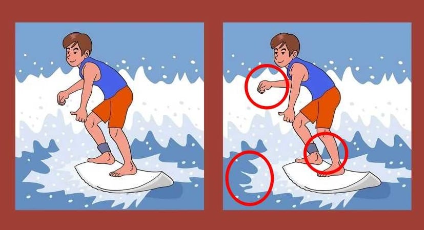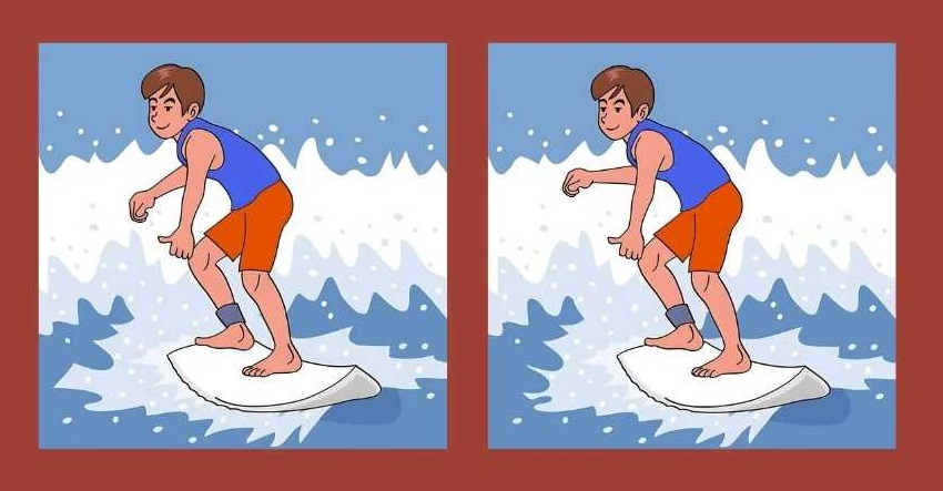 Na obrázku vidíme surfaře, který zdolává vlny na surfovém prkně. Na první pohled se může zdát, že kluci na obou obrázcích jsou stejní, ale když se podíváte pozorněji, zjistíte, že tomu tak není – někde je několik rozdílů, které obrázky odlišují.